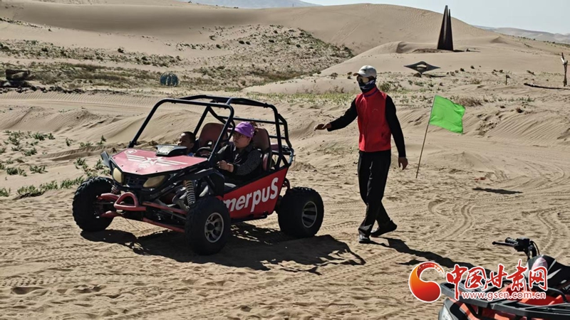 中国甘肃网10月4日讯(西北角·中国甘肃网记者 张振国 通讯员 赵娅维 任志英)国庆长假进入第三天,民勤县苏武沙漠大景区迎来客流高峰,沙海之间欢声笑语不断,游客或体验沙漠越野,或驻足合影,或携家人领略大漠风光。