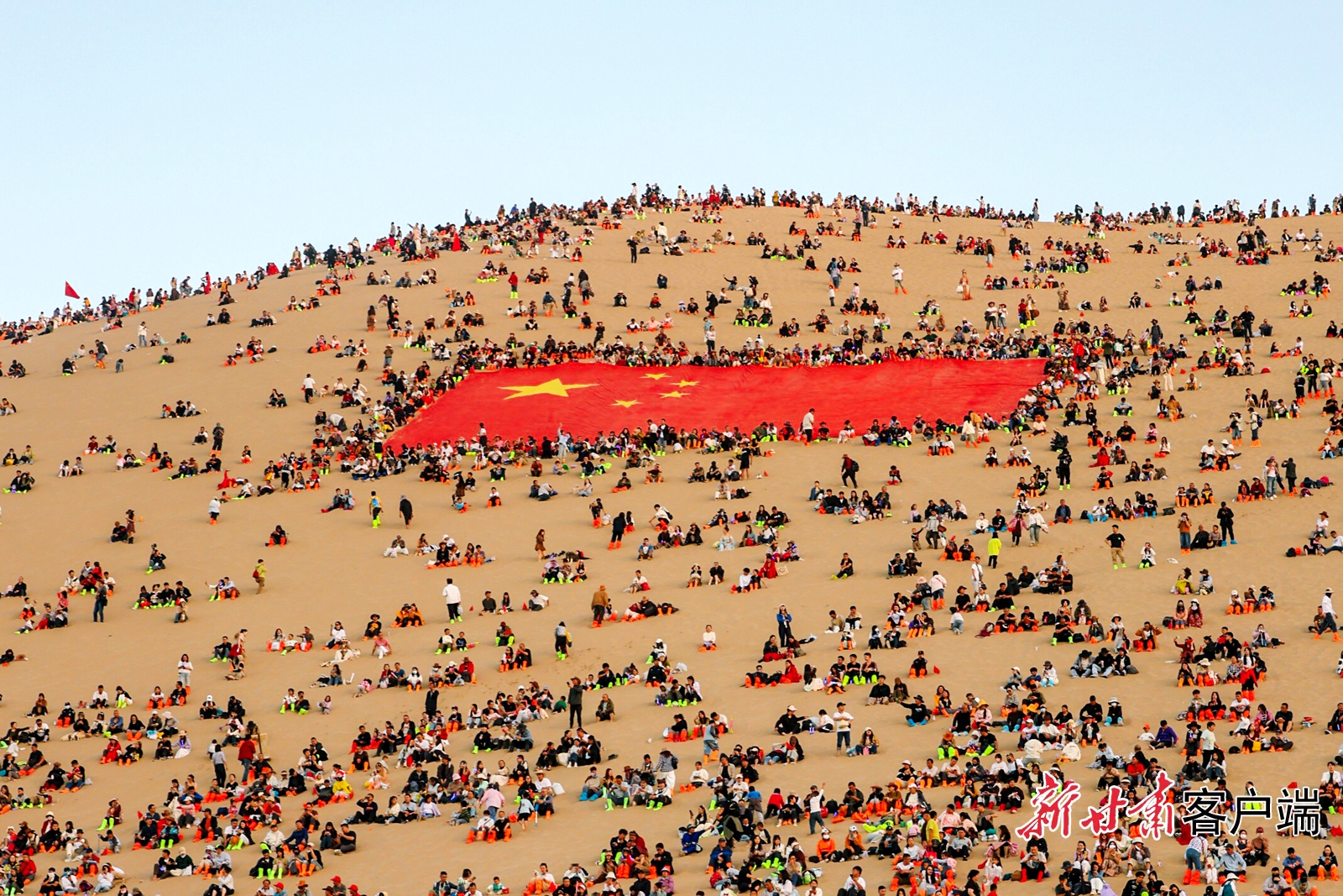 落日余晖中,鸣沙山月牙泉景区举行独有的大漠“升旗仪式”。600平方米巨幅五星红旗由数百位游客护旗手在沙山脚下展开,大家手托国旗边角,踩着软沙将国旗升上鸣沙山。山上山下游客注视着国旗,爱国之情瞬间燃爆。