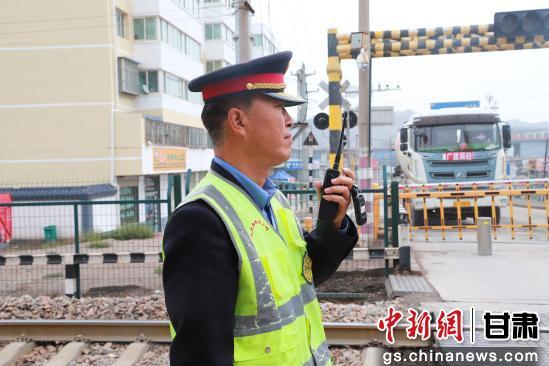 图为兰州西工务段道口工刘文海使用对讲机与即将通过道口的火车司机进行联控。王光辉 摄