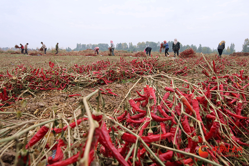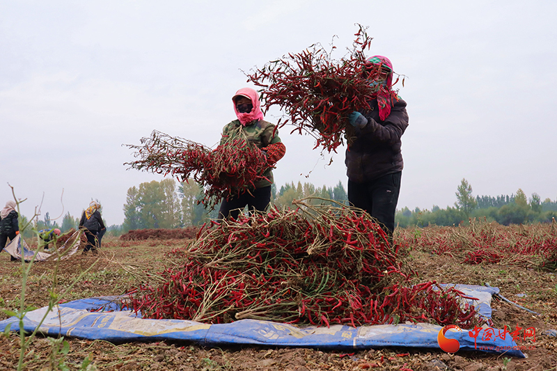 近日,走进临泽县蓼泉镇墩子村的辣椒种植基地,一垄垄辣椒长势旺盛,饱满的辣椒挂满枝头。田间地头,农户们正忙着将砍下的带枝辣椒集中堆放,有条不紊地进行去枝处理,一派丰收忙碌的景象。