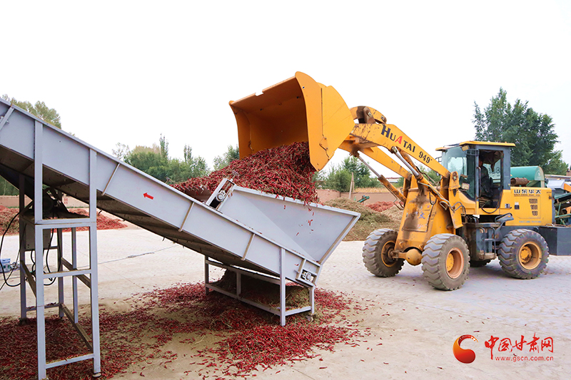 在临泽景诚农业发展有限公司的辣椒加工厂内,记者看到晾晒场上的辣椒铺成“火红”一片;厂房里,辣椒色选机、剪把机高速运转,工人们分工协作,加工现场繁忙而有序。