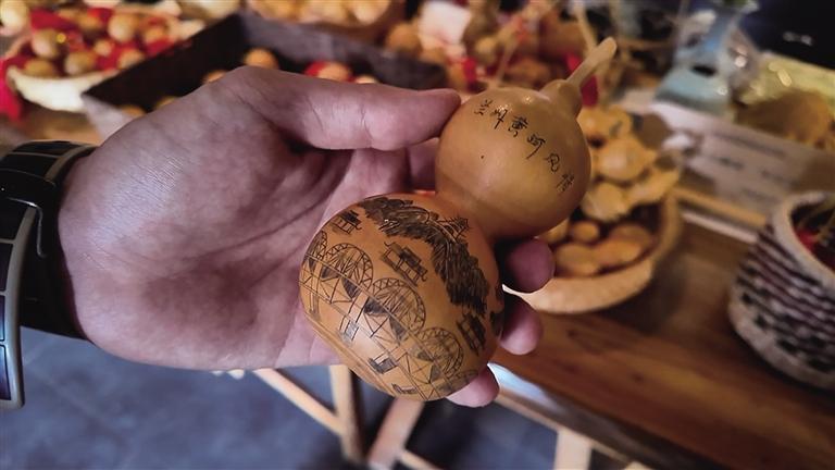 现场,雕刻艺人用小刻刀和雕针,在葫芦表面一点点刻下创作的图样和纹饰,林杰海和邹友亮在一旁观摩并赞叹:“在小小的葫芦上能雕刻出这么精美的画,真是刀尖上的艺术!”观看各种刻葫芦展品,赞叹精致唯美的雕刻图案,他们领略了非遗刻葫芦传达出的文化内涵和生命力。