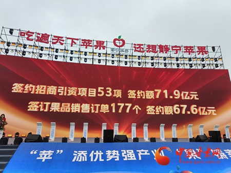 开幕式上,中国果品流通协会、中国苹果产业协会向平凉授予“苹果产业助力乡村振兴共建市”“苹果全产业链标准化建设共建市”牌匾;新华社中国经济信息社发布“静宁苹果”价格指数,中国苹果产业协会发布平凉“静宁苹果”产业<红富士>系列团体标准,平凉市政府发布《平凉市“静宁苹果”产业布局、产品布局、市场布局中长期规划(2025—2035年)》,宣布了“五赛”活动成果。同时,现场举行了静宁苹果产业链招商引资项目签约仪式,共签约招商引资项目53个71.9亿元,签订果品销售订单177个67.6亿元。
