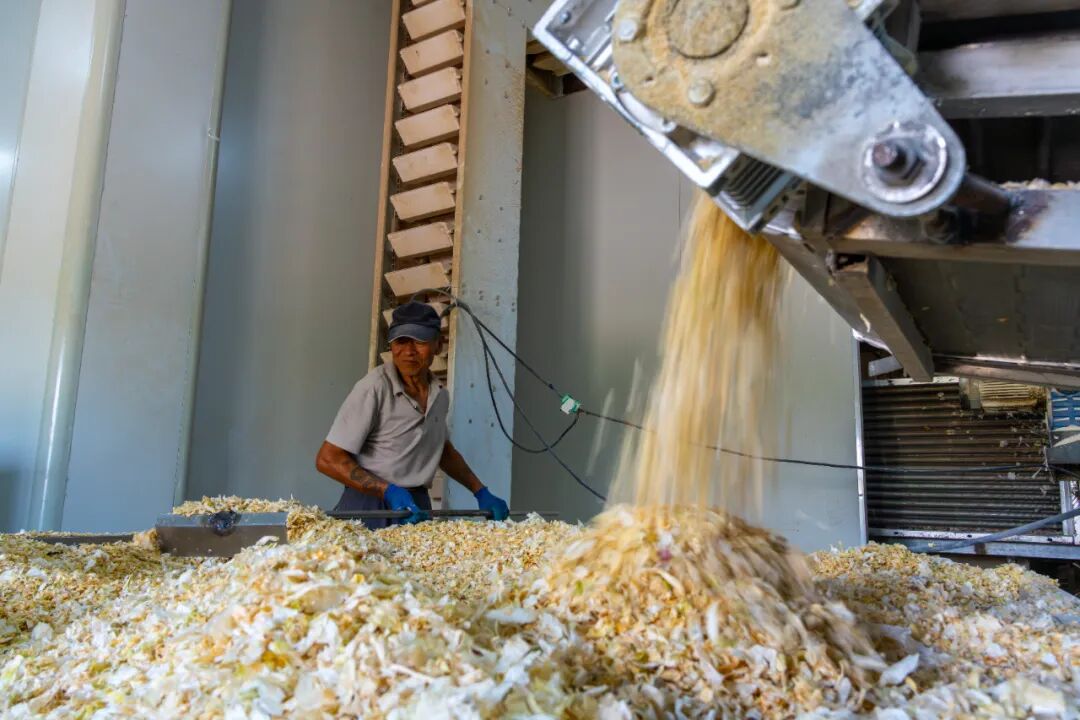 位于位奇镇十里堡村的“山猫”蔬菜加工项目现场,工人们正在对一批刚收购的新鲜洋葱、辣椒进行分拣、清洗、切分。不久后,这些优质的本地蔬菜将经过深加工,变成脱水蔬菜或预制菜配料,身价倍增,销往更广阔的市场。