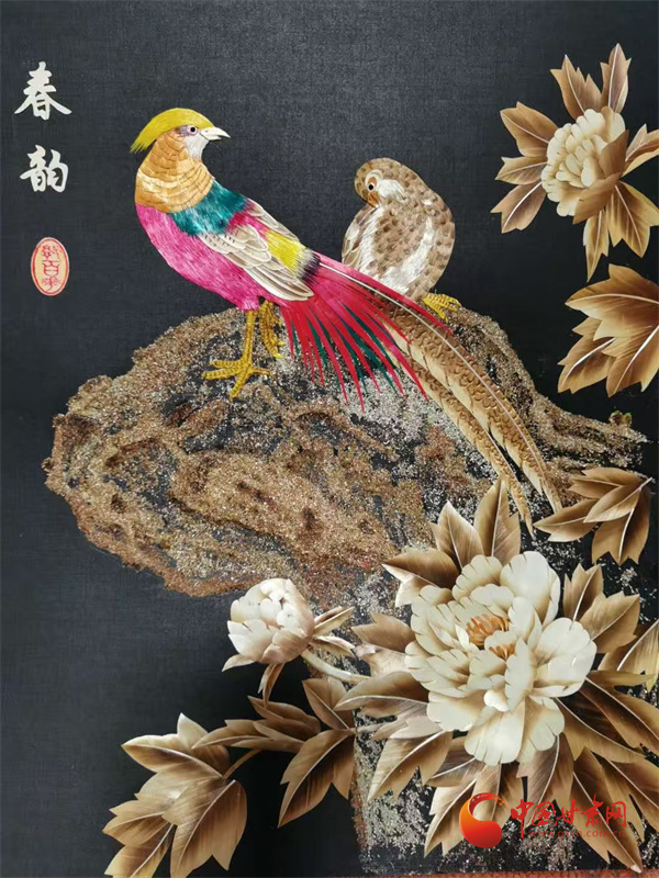 多年打磨后,郭百花走出了独特的创作之路——以拼贴手法为主,让作品更具层次感与立体感。在她十几平米的“百花麦秆艺术工作室”里,《春韵》勾勒出江南诗意,《敦煌文旅》再现丝路风情,《孔雀戏牡丹》尽显雍容华贵,而《锦上添花》中,小鸟的羽毛竟由细如发丝的麦秆剪贴而成,市场价达1500元左右。这些作品里,既有山川花鸟的灵动,更藏着通渭的乡土记忆,平凡麦秆在她手中彻底“化腐朽为神奇”。