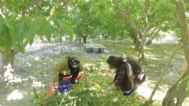 在南门村一家规模较大的果园,连片的桃林一眼望不到头,翠绿的枝叶层层叠叠,一颗颗“茉莉清桃”点缀其间,园内10余名村民忙着采摘、分拣、装箱,有条不紊。“现在已经到桃子的采摘旺季,我来帮舅舅摘桃子,要赶在霜冻前打包销售。”王晓童说。
