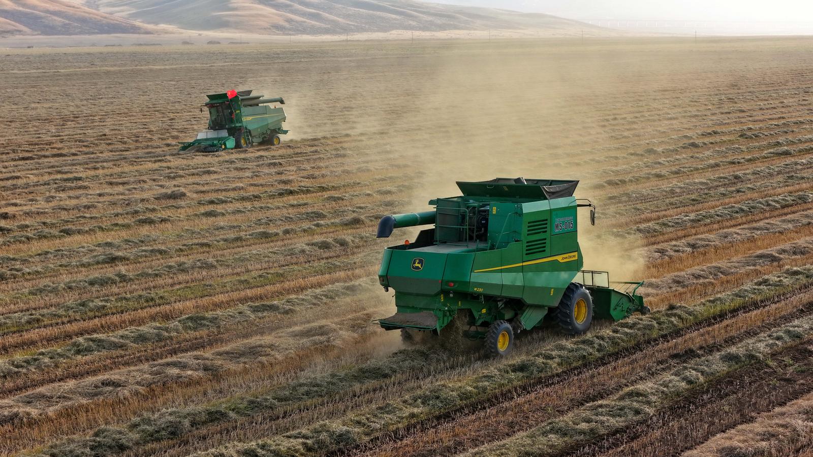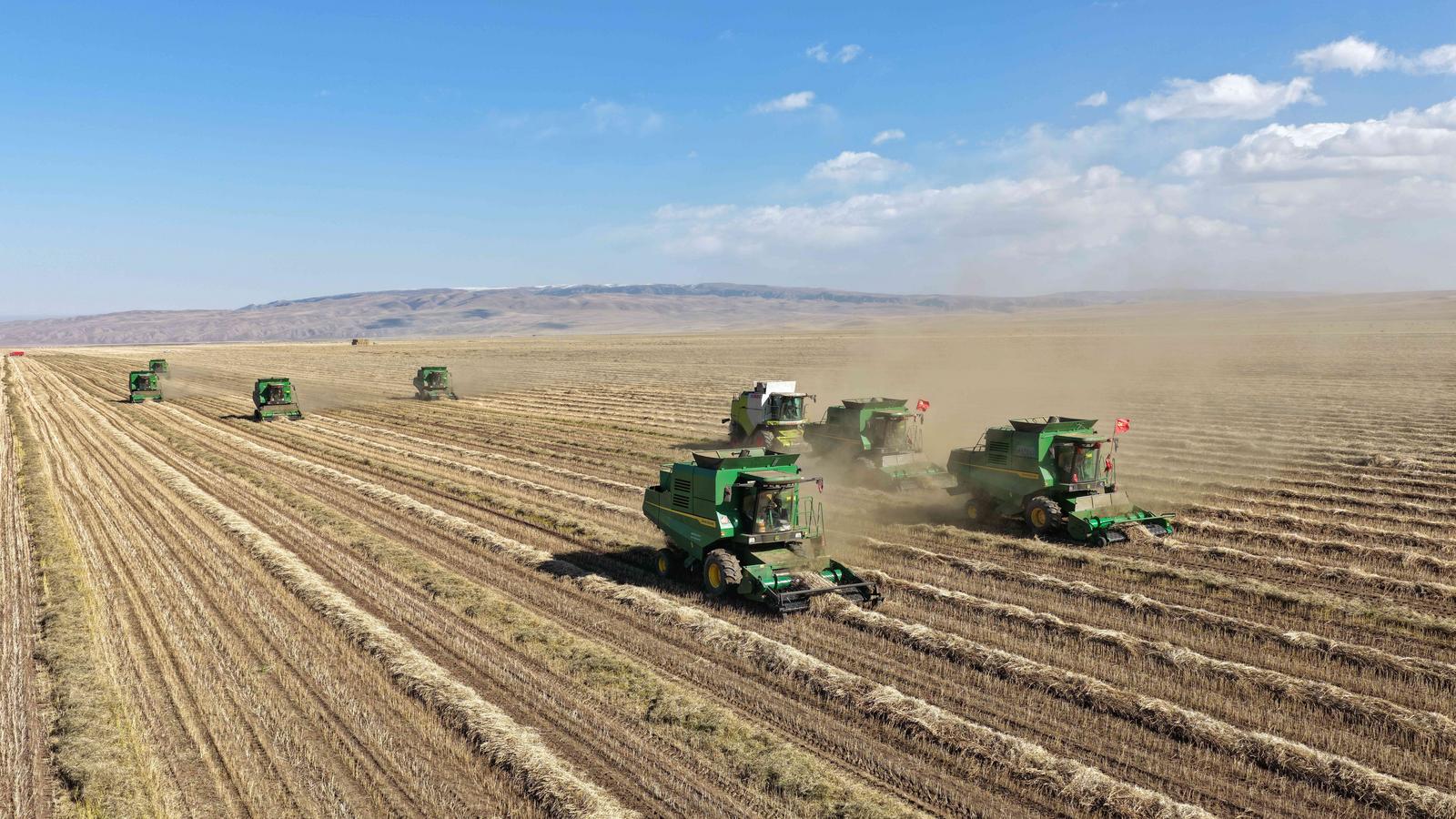 位于河西走廊中部的山丹马场,海拔高、气候冷凉,得天独厚的自然条件使其成为高原夏菜和优质粮油作物的重要产区。时下,油菜等作物相继成熟,连片农田宛如金色织毯,铺展至祁连山脚下。收割机群开足马力,有序推进,一次性完成作物的收割、脱粒和秸秆处理,大大提升了收割效率。