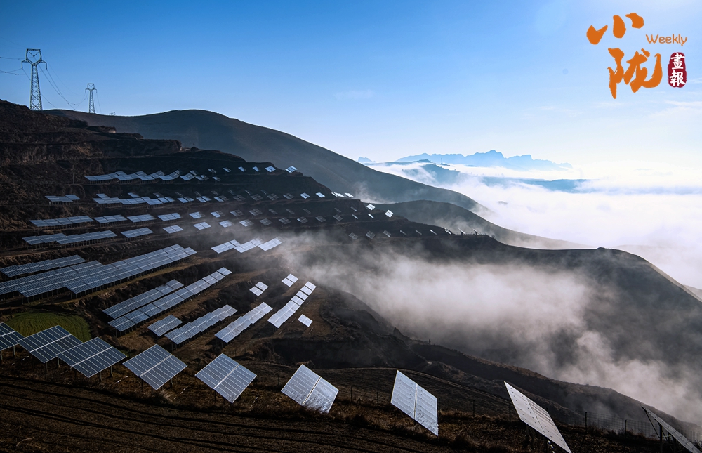 成排的太阳能光伏电板如蓝色鳞片,鳞次栉比地镶嵌在山坡上,与天际悠悠的流云、远处起伏的山峦相映成趣。科技之美与自然之韵在这里悄然融合,共同绘就出一幅绿色发展新画卷。
