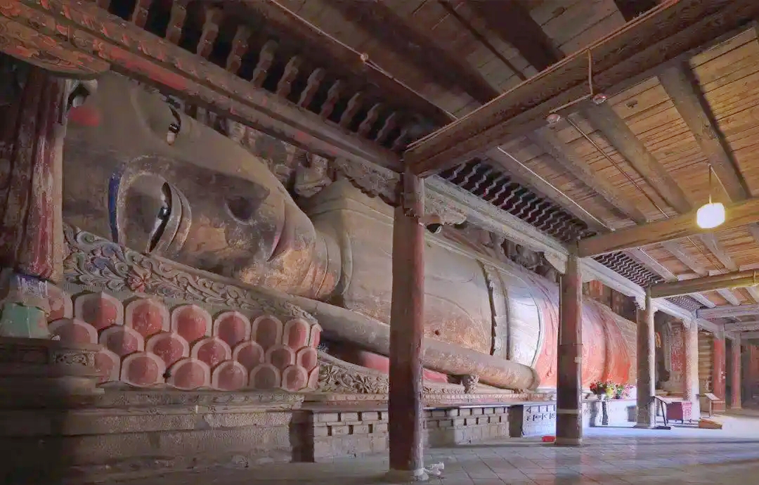 卧佛内中空的独特设置一是为了减轻大佛的重量,二是在中空的大佛体内,藏有佛经、铜镜、铜钱等物,象征“心明如镜”“肚量如海”。