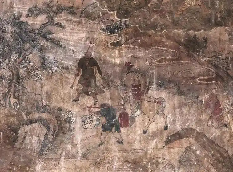 有趣的是壁画中,唐僧往往安坐在白龙马上,沙僧牵马,孙悟空一路游手好闲、消极怠工,猪八戒却成为了四人中最勤勤恳恳的一个,不仅帮师父化缘取水、身兼探路,一路挑着重担,有勇有谋,形象与吴承恩所写的《西游记》中完全不同。
