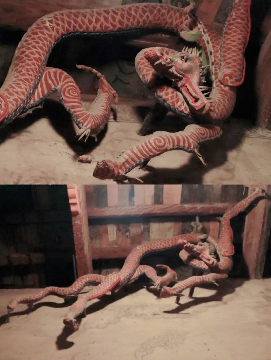 位于大殿北侧的降龙罗汉手执绳索却并无捕获,他的眼睛望向斜上方的大殿的屋梁,顺着他的目光可见有一条五爪金龙神气活现地盘踞在那里。五爪之龙在古时谓之为天子的象征,也是,大佛寺是西夏的皇家寺院,既是天子,岂有被罗汉降服之理?这便是在大佛寺内特有的“降龙罗汉不降龙”。