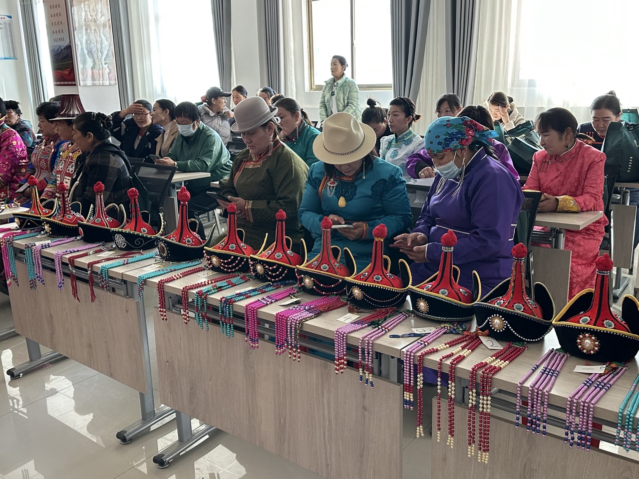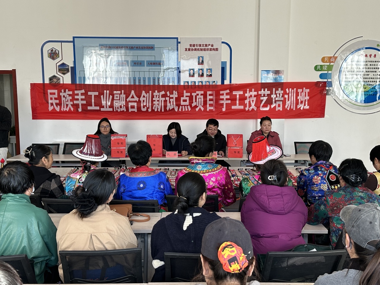 此次结业仪式既是对培训成果的集中展示,更是铸牢中华民族共同体意识的生动实践。在现场,学员们精心展示了培训期间完成的刺绣作品,色彩艳丽的裕固族头面、做工精致的蒙古族帽子,每一件作品都凝聚着学员们的用心与汗水,充分展现了大家的学习成果和对非遗文化的热爱。经过康乐镇和白银蒙古族乡的学员互评互选,8件兼具创意与技艺的作品脱颖而出,分别获得一、二、三等奖,台下响起阵阵掌声,获奖学员们脸上洋溢着自豪的笑容。