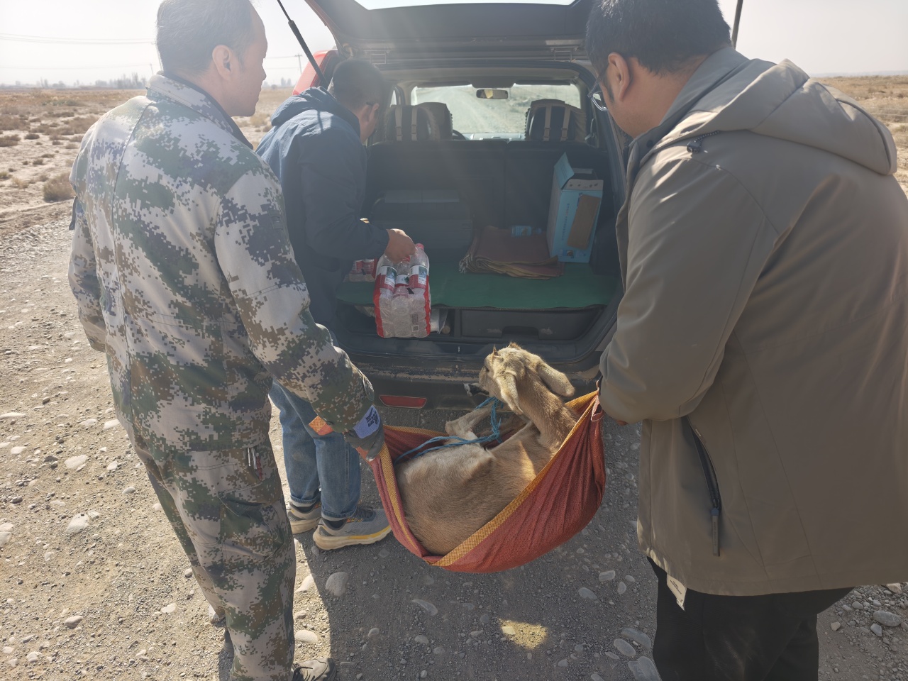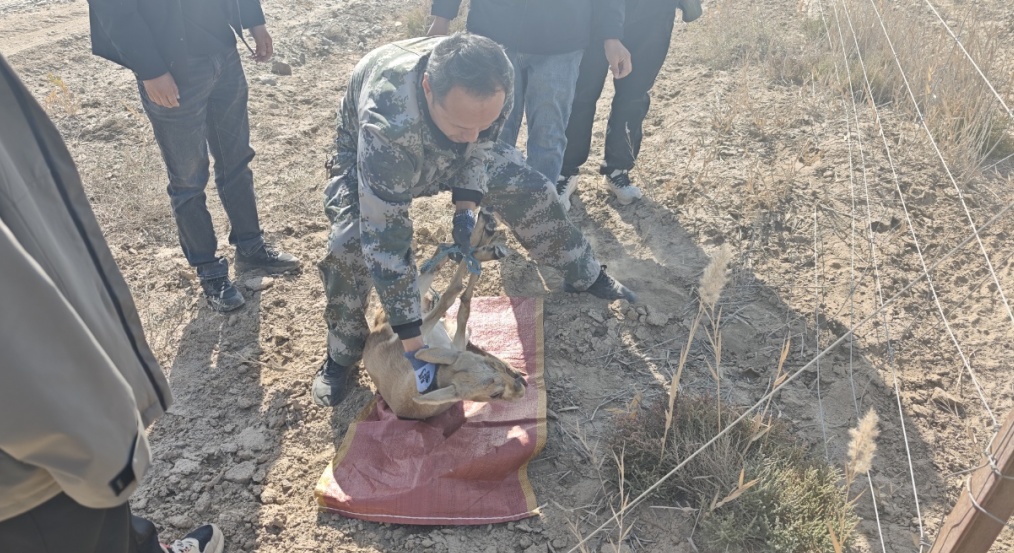 10月20日,肃南县明海林场接到明花乡群众求助电话,称在辖区荒漠草原地带发现一只疑似受伤的野生羚羊,无法正常活动,请求专业救助。接到消息后,明海林场立即启动野生动物应急救助预案,组织生态管护人员与生态义警组成救援小组赶赴现场查看。