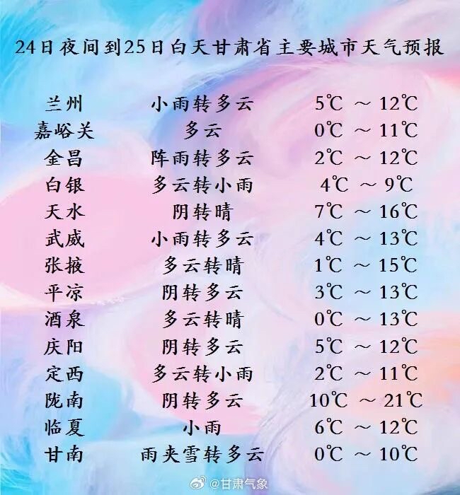 10月24日夜间到10月25日白天,酒泉、嘉峪关、张掖三市多云,局部地方阴有阵雨(雪);省内其余地方阴间多云,大部分地方有小雨(雪)或雨夹雪,其中祁连山东部有中到大雪,甘南州西部及兰州市西北部局部地方有中雪。另外,25日清晨陇东有雾。