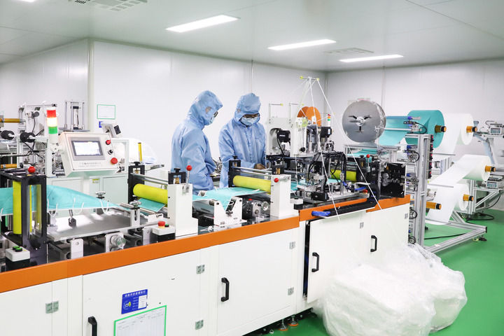 3月6日,在兰州西脉国际医疗集团股份有限公司口罩生产洁净车间,员工操作口罩生产设备。(兰州市委宣传部供图)