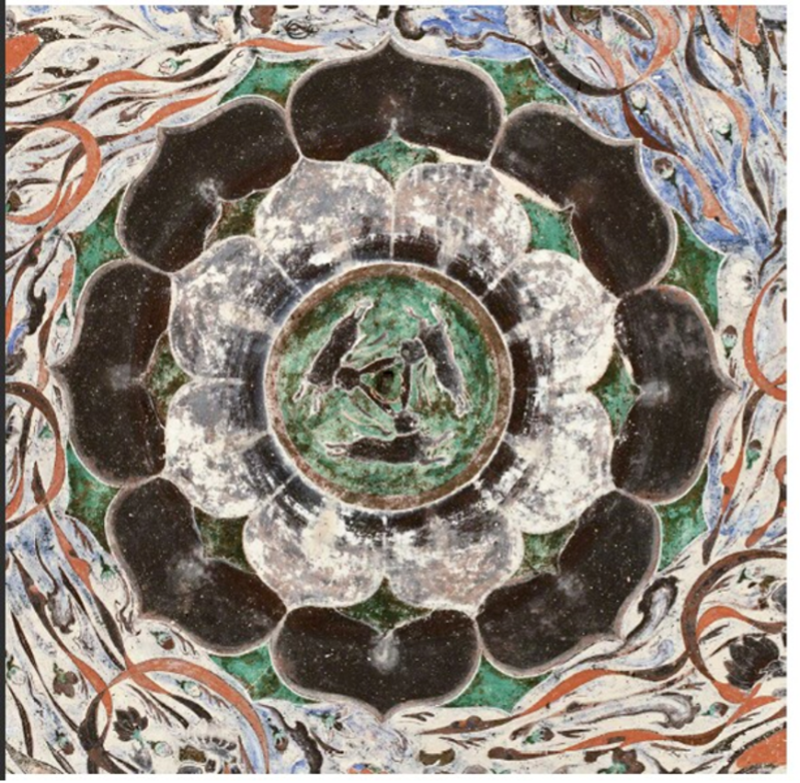 踏入窟内,仰头凝望,藻井中央那朵八瓣莲花宛如夜空中绽放的星辰,花瓣层层叠叠,细腻而生动。莲花中央,是独具匠心的三兔连耳图案。