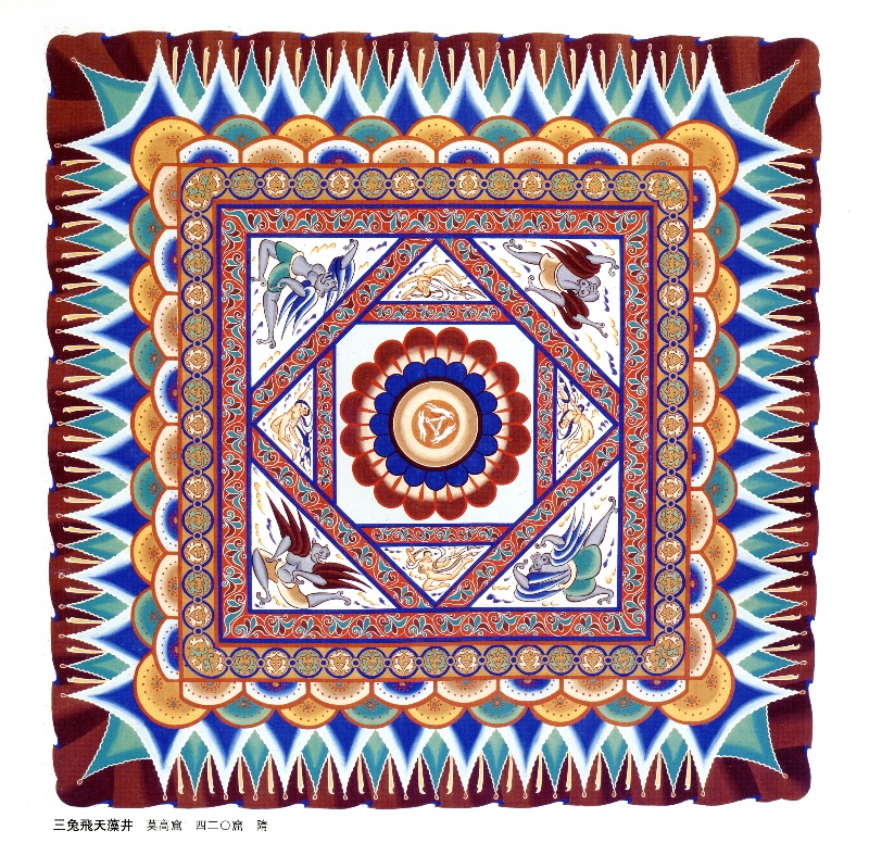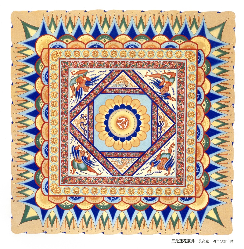 三兔共耳图案、成熟的飞天造型、精美的纹饰图案相互映衬,共同构成了这幅令人叹为观止的藻井壁画,受到人们的广泛关注和喜爱。