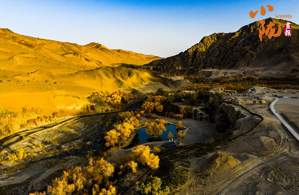 成千上万棵金黄的胡杨沿峡谷肌理蜿蜒,虬枝盘曲如岁月镌刻的诗行,清溪潺潺从树下流过,将胡杨的金黄、沙山的黛青、天空的湛蓝揉成一幅流动的画。