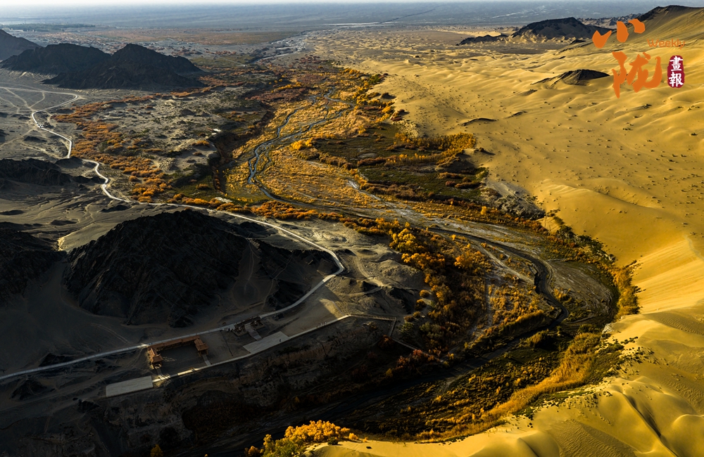 四周被连绵起伏的沙丘环绕,湖水如镜,美丽的胡杨倒映在水中,与湖中游弋的天鹅、岸上伫立的小木屋,完美结合在一起,把整个戈壁沙漠点缀得生气蓬勃。