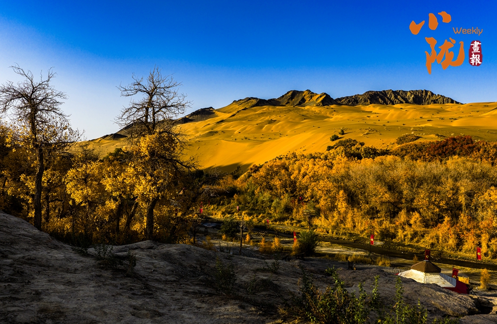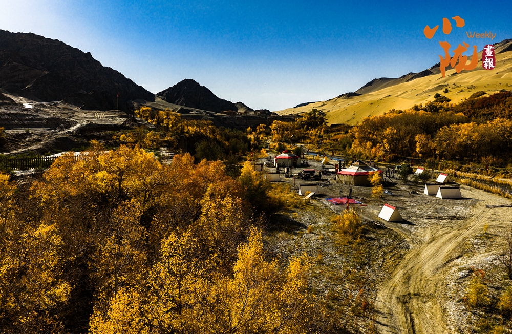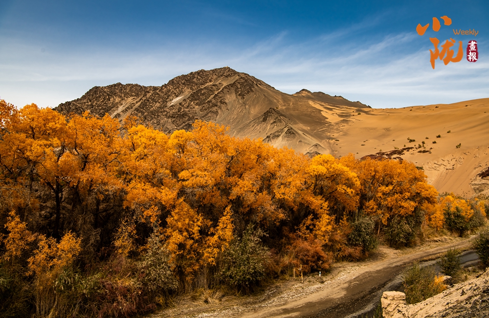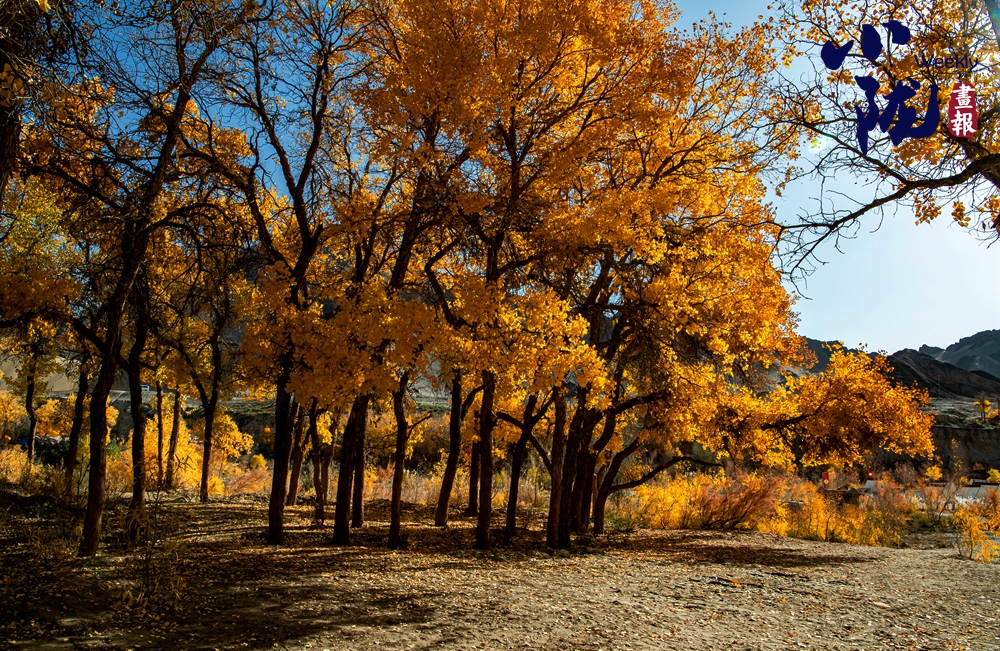 每年10月下旬,是多坝沟胡杨峡胡杨的最佳观赏期。金黄色的胡杨,与周边沙山、溪流交织成色彩斑斓的景观,形成荒漠地带独特的生态画卷。