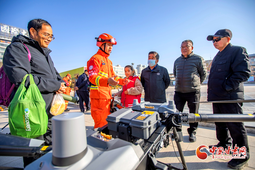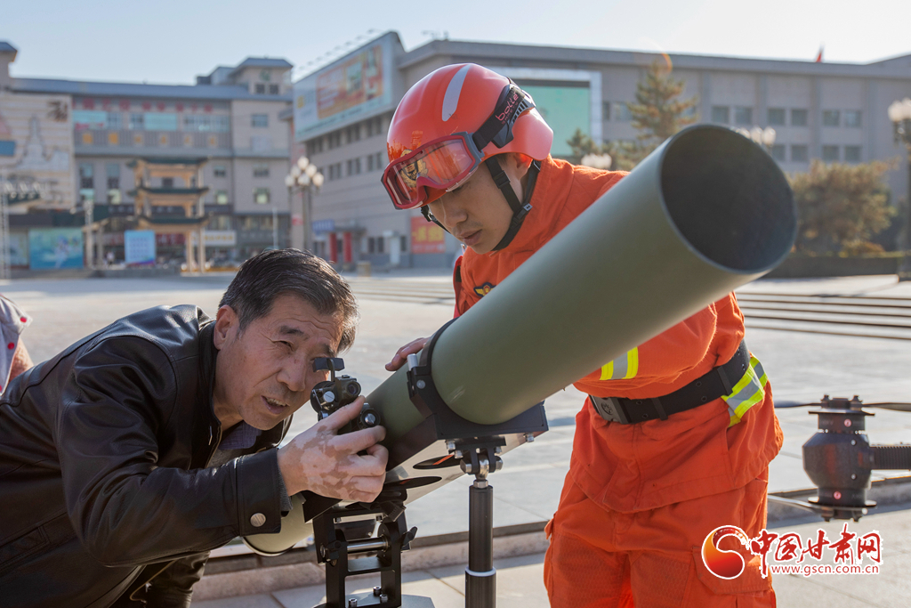 消防队员给裕固族群众讲解地震救援装备液压扩张器在救援中的用途