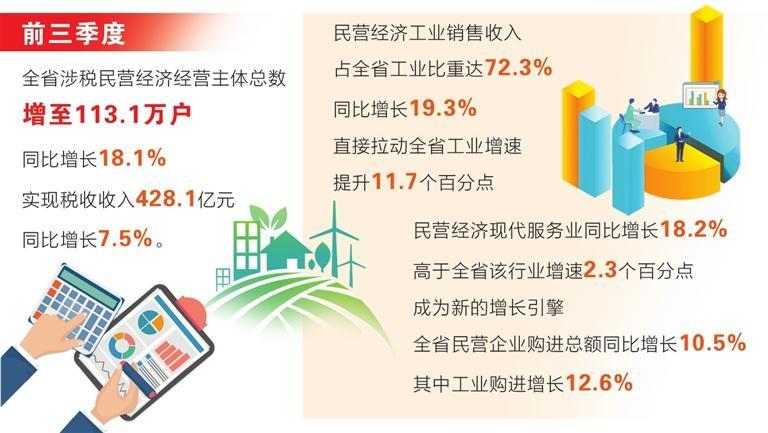 自2024年我省推进经营主体倍增计划以来,民营经济在经营主体数量、就业规模、税收增长与销售扩张等多个维度均表现出较强活力。今年截至9月底,民营经济经营主体占比达96.1%,其中,新登记经营主体12.98万户,同比增长1.1%,显示经营主体活跃度稳步提升。同期,民营经济实现销售收入2.08万亿元,同比增长12.2%,增速高于全省平均水平6.3个百分点。