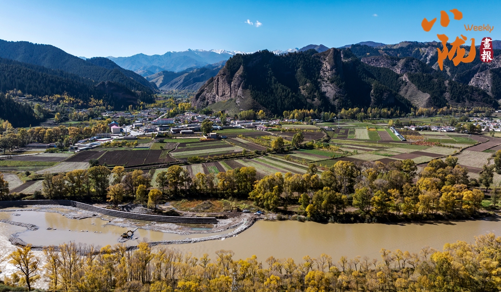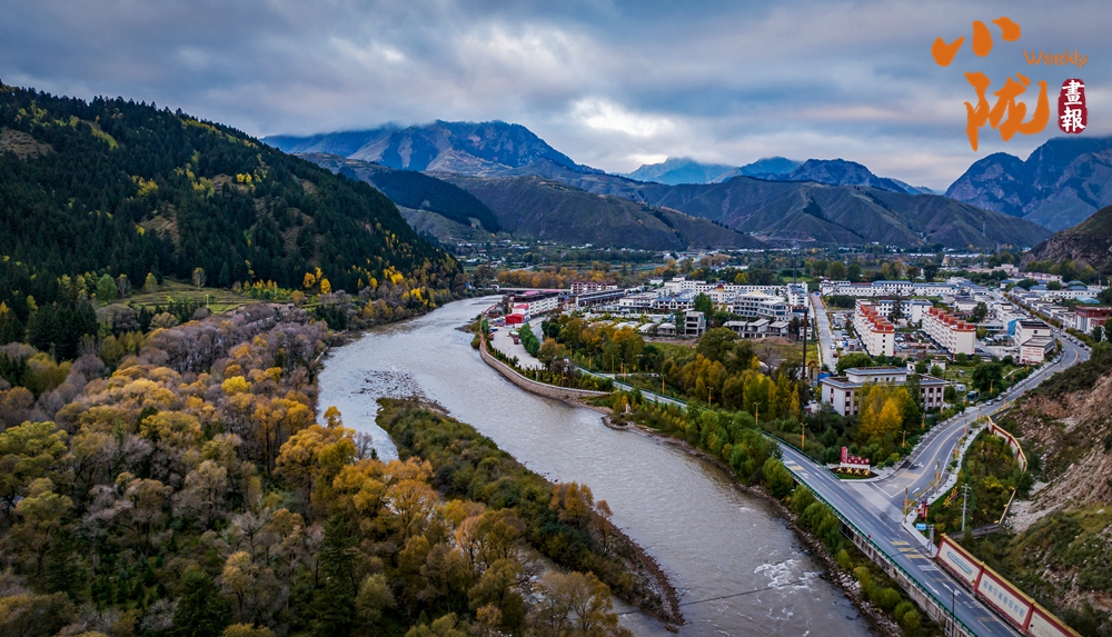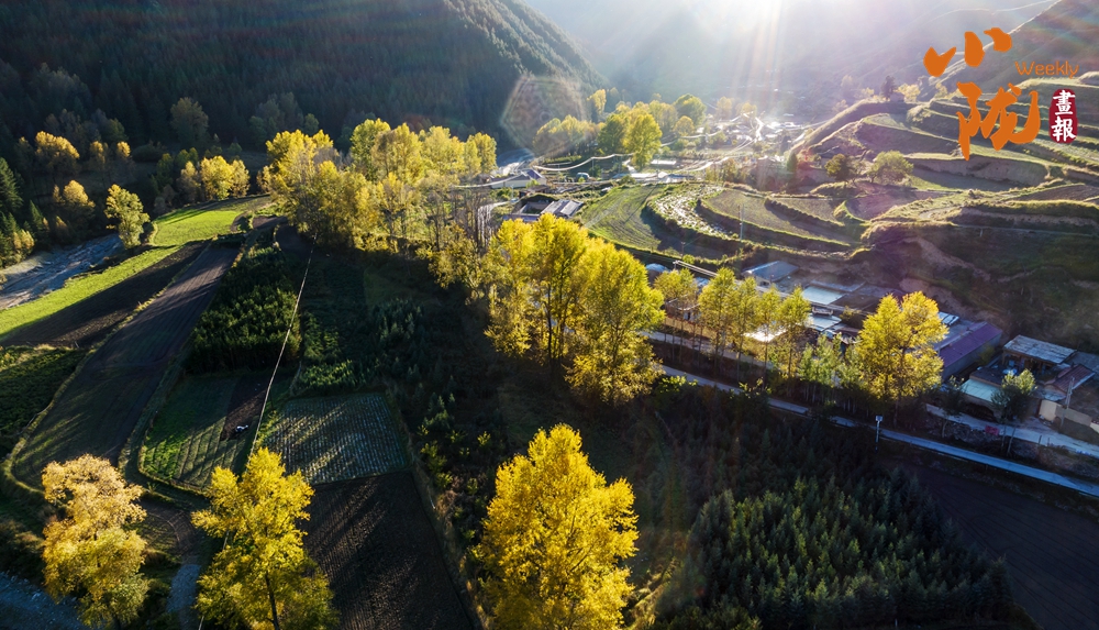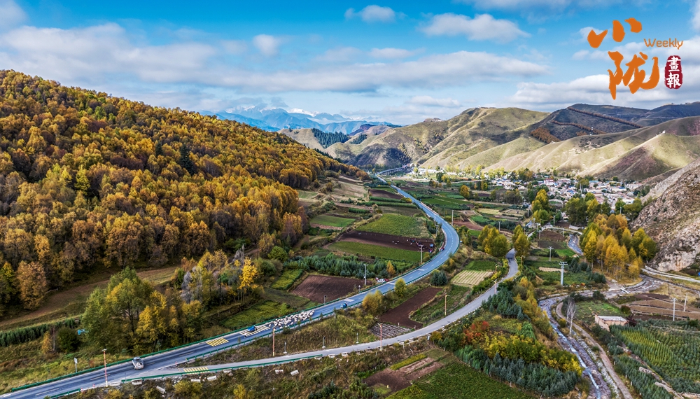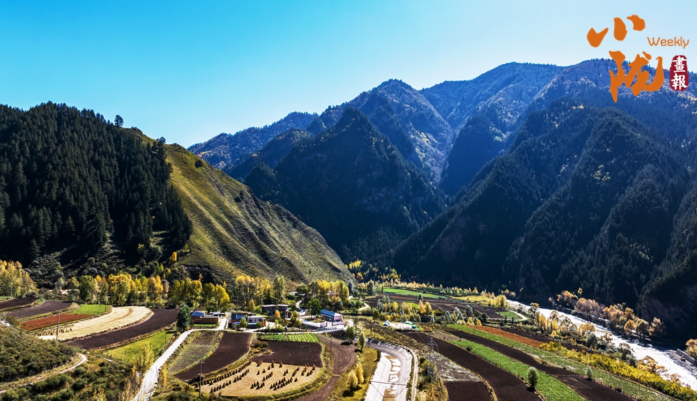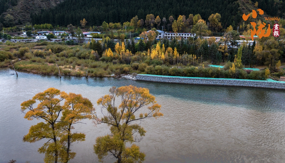 杨树金黄、松柏苍翠,漫山遍野的色彩层层叠叠,搭配山间溪流与民舍,尽显高原秋景的辽阔与诗意。