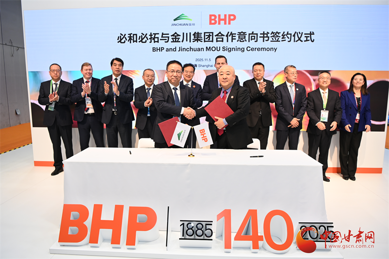 中国甘肃网11月5日讯(西北角·中国甘肃网记者 宋芳科)11月5日,在第八届中国国际进口博览会上,金川集团与全球矿业巨头必和必拓成功签订2026年铜精矿合作备忘录,进一步巩固了双方长期以来的战略合作伙伴关系,为全球铜资源市场的稳定供应和可持续发展注入了新动力。