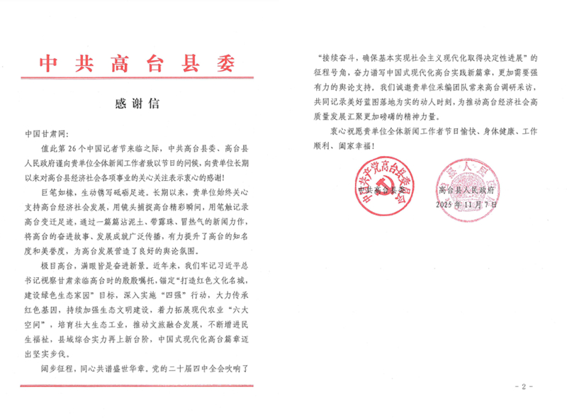 中国甘肃网11月7日讯(西北角·中国甘肃网记者 孙珩力)在第26个中国记者节来临之际,中共高台县委、县人民政府致信中国甘肃网,向网站全体新闻工作者致以节日的诚挚问候,并对中国甘肃网长期关注和支持高台县经济社会发展表示衷心感谢。