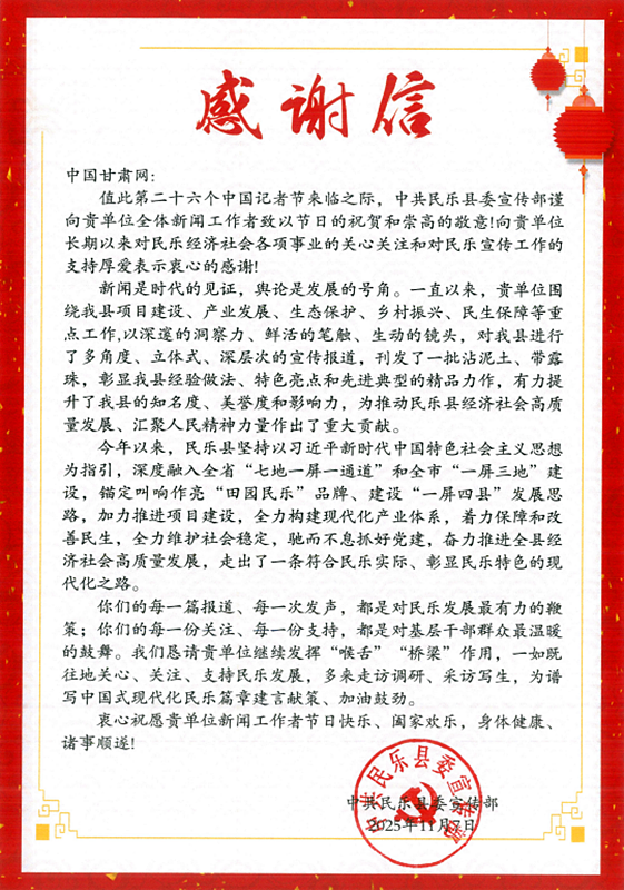 中国甘肃网11月7日讯(西北角·中国甘肃网记者 刘姗)在第二十六个中国记者节来临之际,中共民乐县委宣传部向中国甘肃网全体新闻工作者发来贺信,送上记者节祝福。