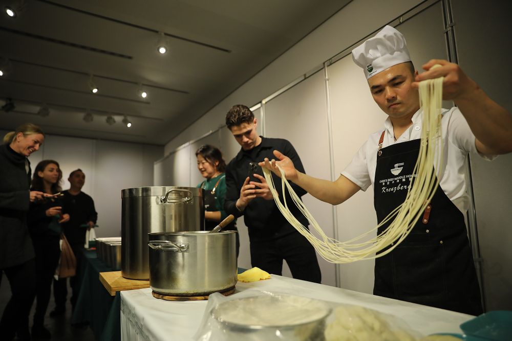 这是11月11日在柏林中国文化中心拍摄的兰州牛肉面制作现场。新华社记者 杜哲宇 摄