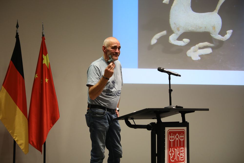 11月11日,在德国柏林,德国旅行社代表海因里希·克里韦特在甘肃文旅宣传推介会上分享他在甘肃旅行的难忘经历。新华社记者 杜哲宇 摄