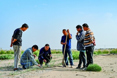 新疆尉犁县护林员查看罗布麻长势。新华社发