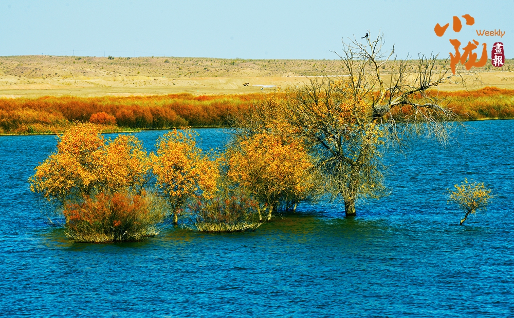 天蓝蓝,水蓝蓝,水天一色。红柳簇拥成焰,燃烧在水中央,显得格外夺目,展现出荒漠特有的壮美与生机。