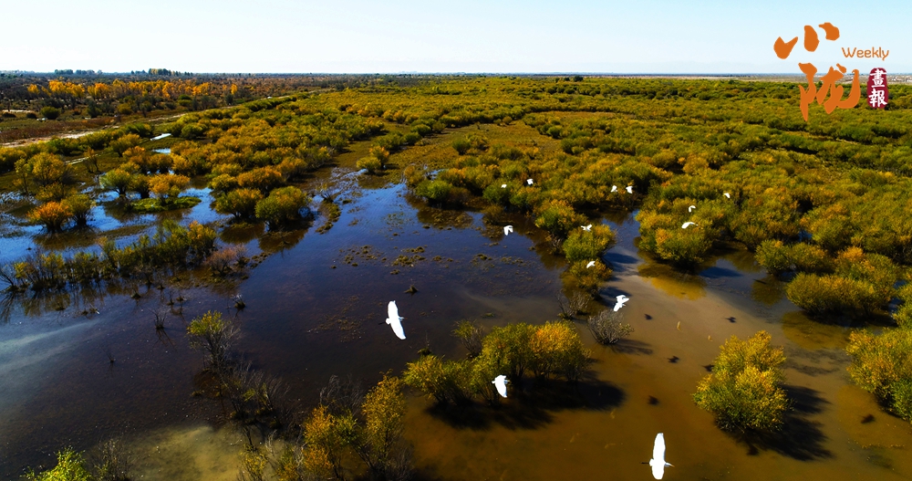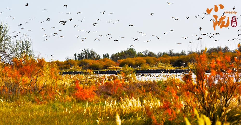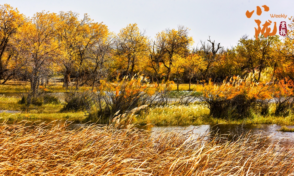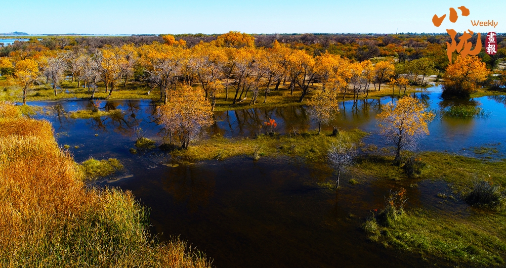 每到冬季,湿地的胡杨换上金黄盛装,与穿梭其间的湖水、温暖柔和的芦苇荡,绘制成一幅水墨长卷,将初冬的浪漫铺满天地。