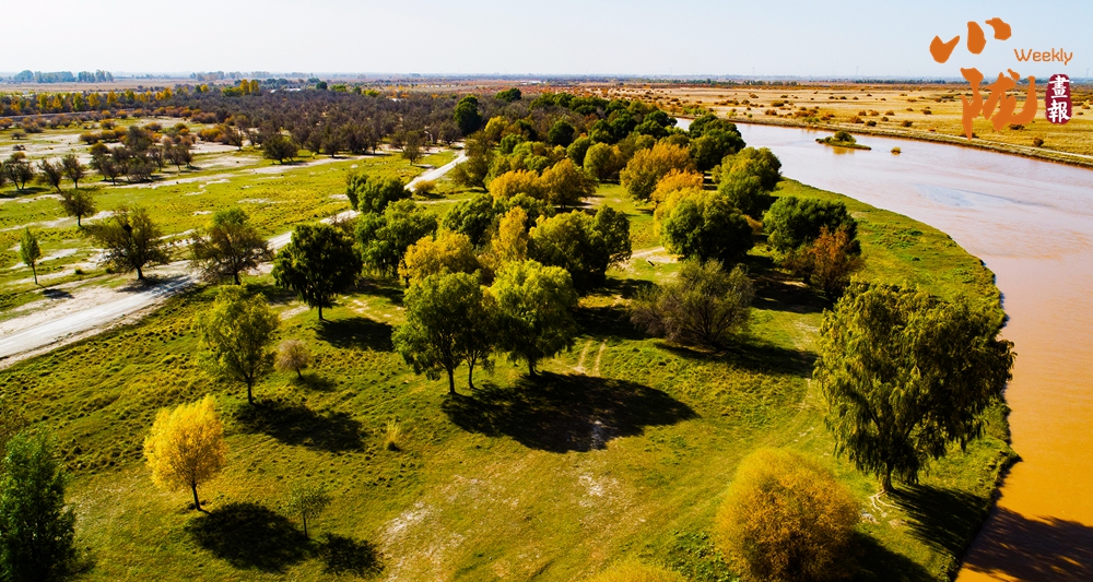 五彩斑斓的胡杨林将湿地装点得生机勃勃,仿佛沙漠中的一片绿洲。正是这些胡杨、红柳、河柳组成的混交林带,像坚韧的绿色长城,锁住了流动的沙丘。
