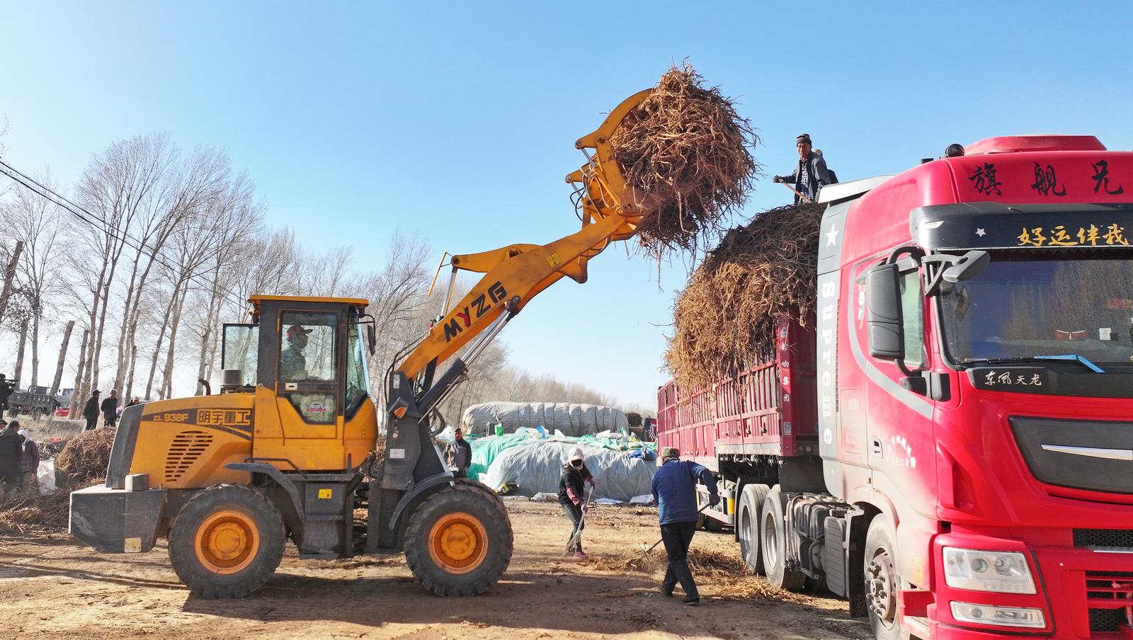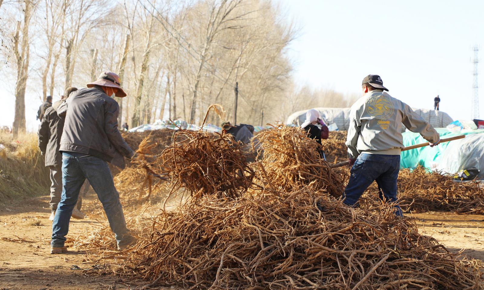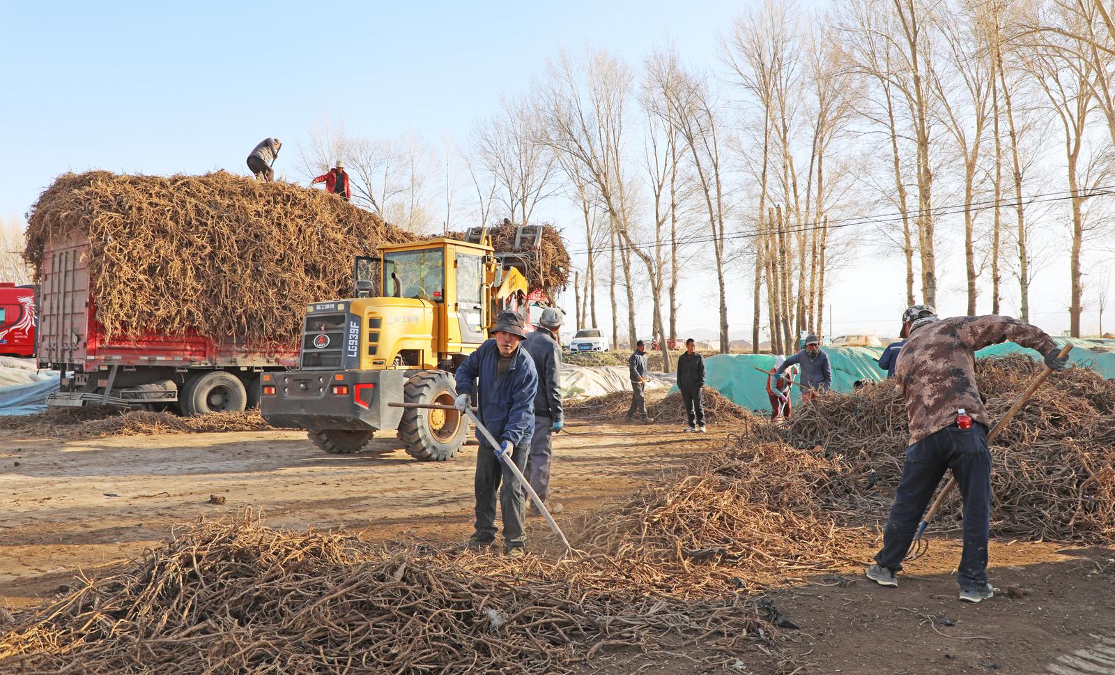 2025年11月12日,在甘肃省张掖市民乐县顺化镇旧堡村,药农们正忙着将采收的黄芪装车运往亳州、陇西等地销售。