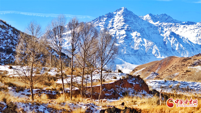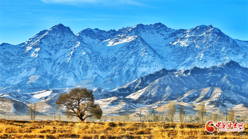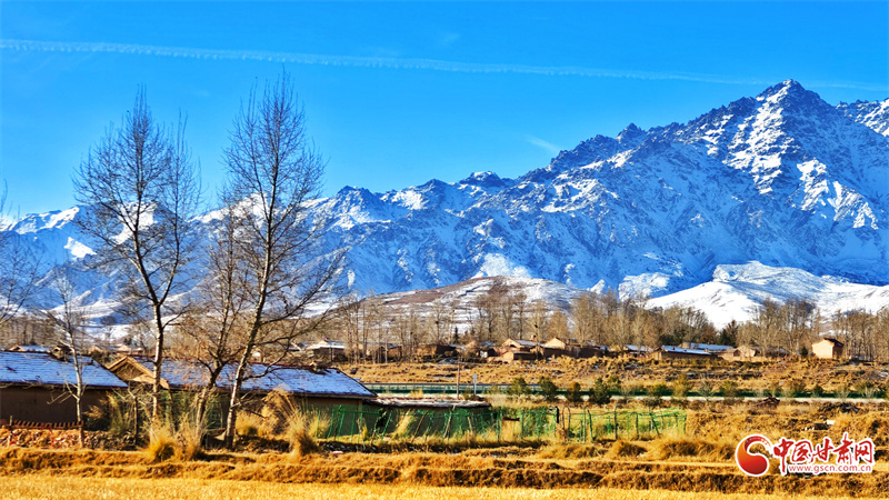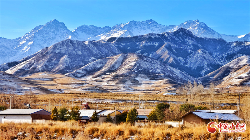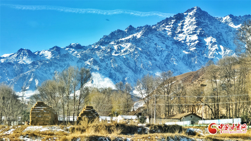 初冬,张掖市民乐县风光旖旎。远处,祁连山脉巍峨挺立,山顶皑皑白雪与澄澈蓝天相映,圣洁雄浑尽显。山峦层次错落,覆雪处银装素裹,露岩处黛色深沉,光影交织间勾勒出硬朗轮廓。山脚村落里,房屋错落有致,树木有的枝桠疏朗,有的残叶点缀,与金黄草地相映,宛如一幅无声却动人的画卷,令人心驰神往。