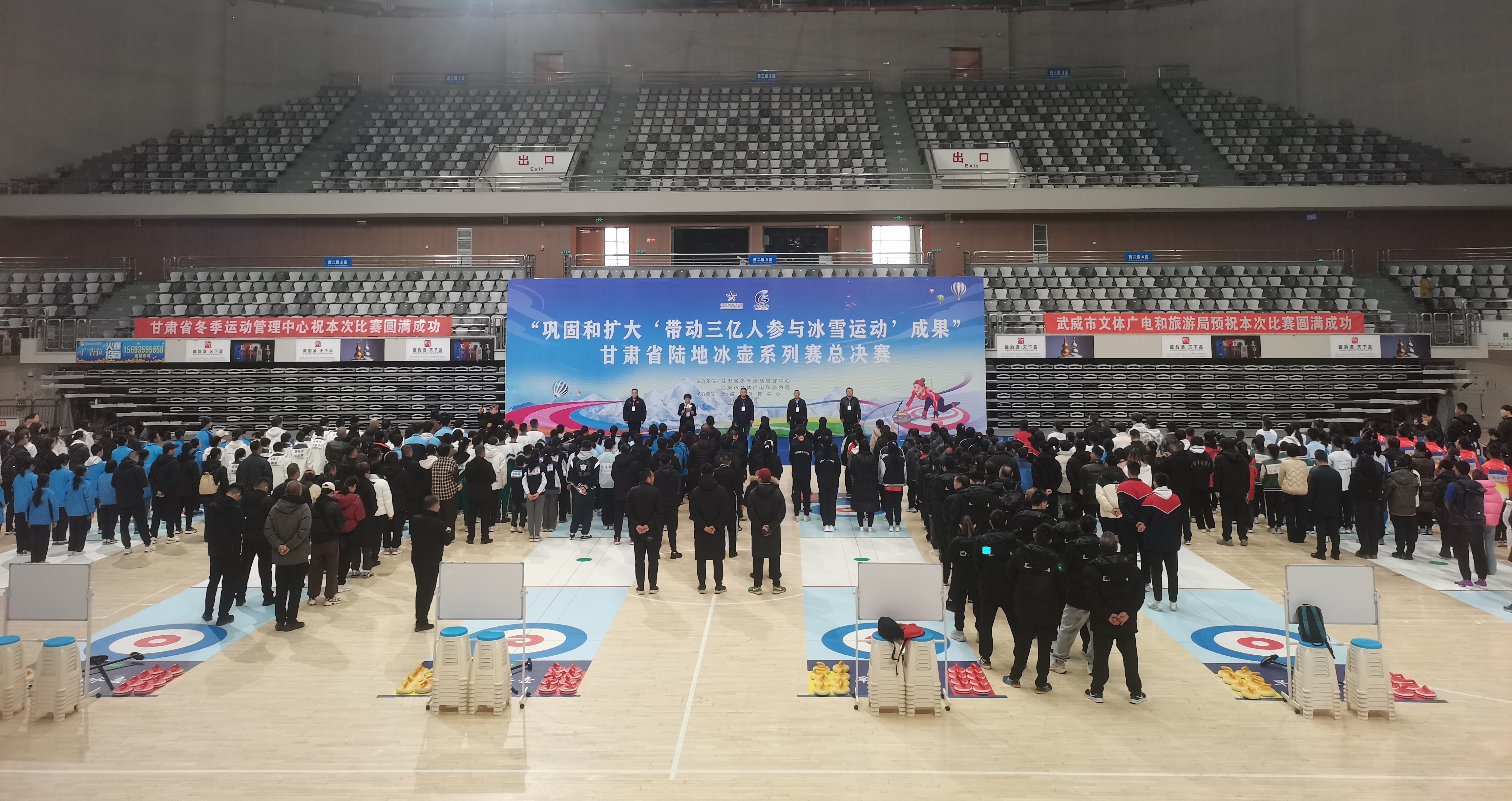 中国甘肃网11月22日讯(西北角·中国甘肃网记者 张振国 文/图)11月22日,“巩固和扩大‘带动三亿人参与冰雪运动'成果”甘肃省陆地冰壶系列赛总决赛在武威市体育馆开赛。本次比赛由省冬季运动管理中心、武威市文体广电和旅游局主办,武威市体育中心承办,来自全省32支参赛代表队近500人参赛。
