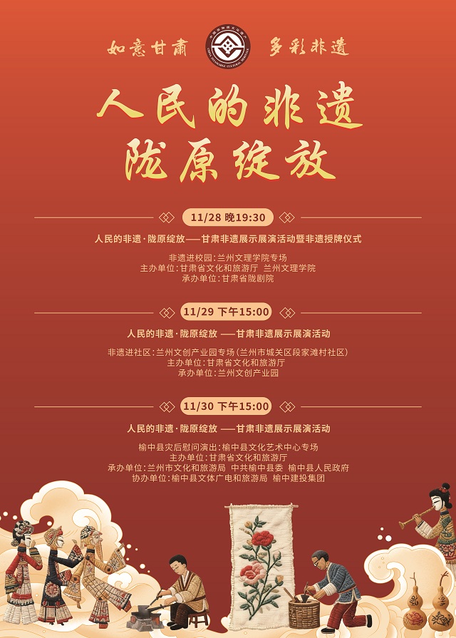 11月28日,“人民的非遗·陇原绽放”——甘肃非遗展示展演活动暨非遗授牌仪式将在兰州文理学院拉开帷幕;