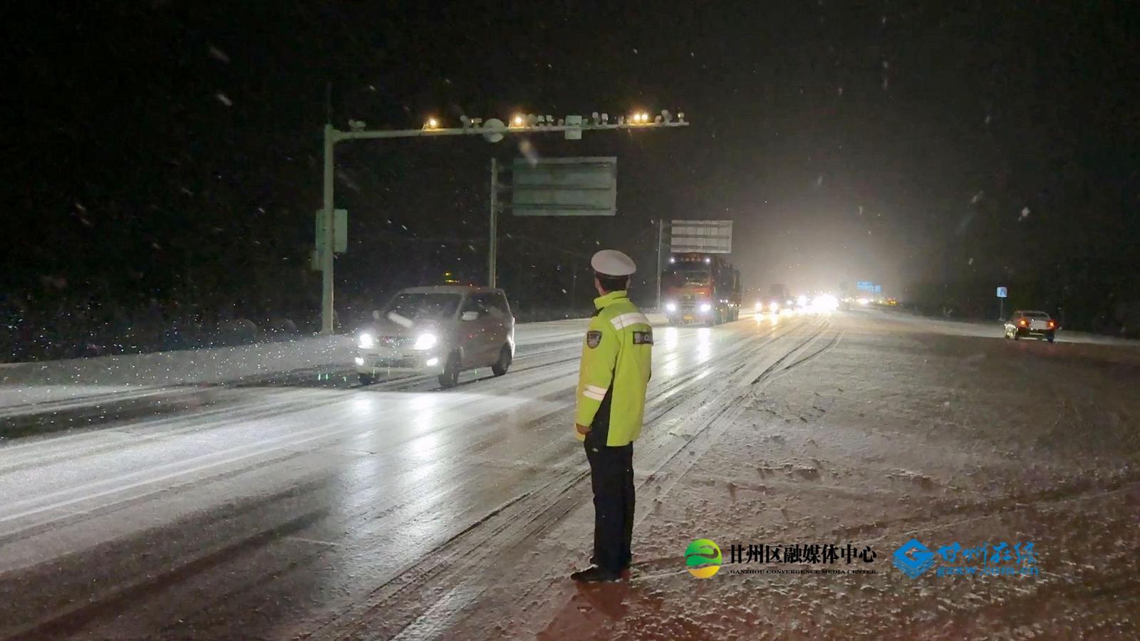 同时,为应对降雪影响,市公安局甘州分局交警第一时间在城区主干道、高速路口等关键节点部署警力,全力开展交通安保工作。执勤民警在车流密集处疏导指挥,在结冰湿滑的坡道,帮助打滑停滞的车辆脱困,保障了道路有序通行,全力守护群众出行平安。
