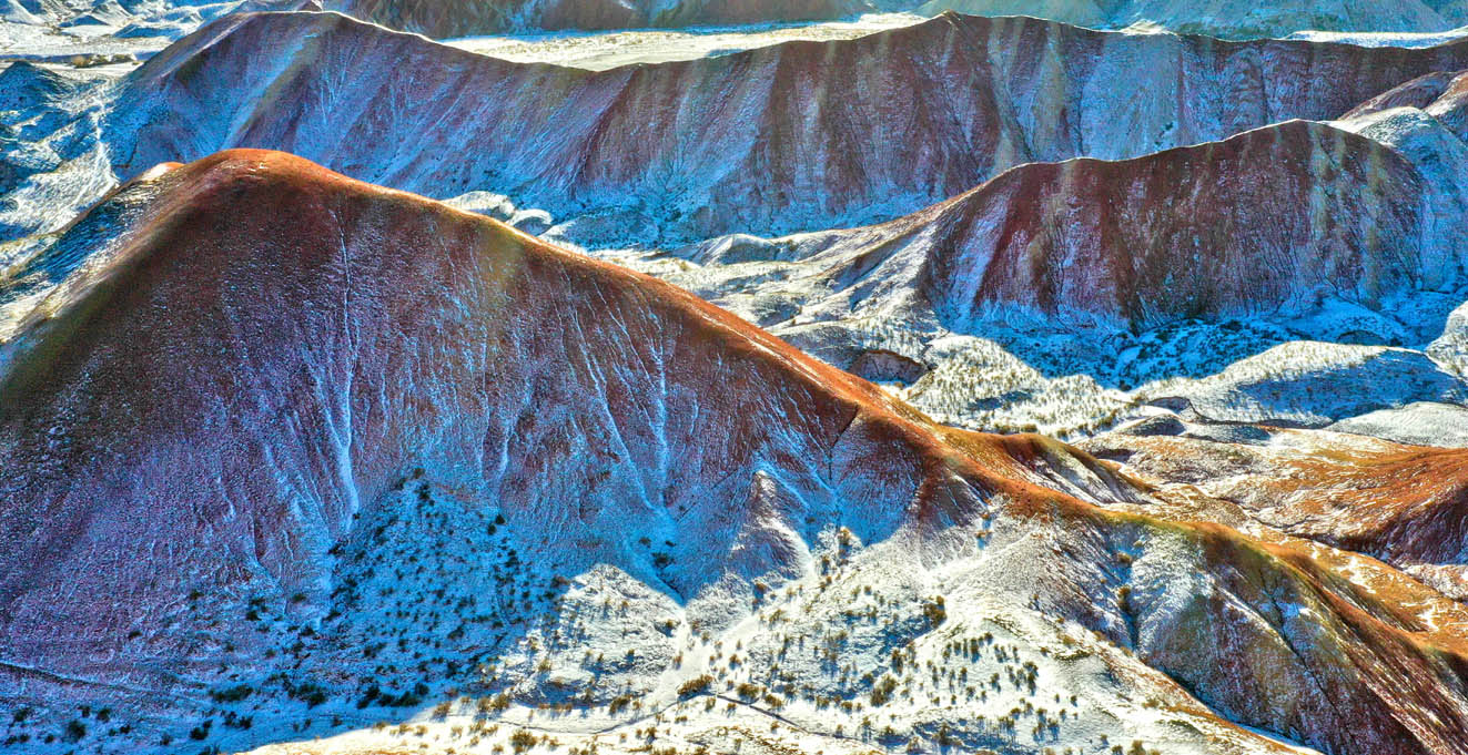 11月24日,张掖市降下今冬第一场雪。雪后初晴,张掖七彩丹霞的彩色丘陵披上一层白雪,宛如轻纱覆于丹霞之上,构成一幅斑斓的水彩画卷。“雪浴丹霞” 的绝美景色跃然眼前,尽显大自然的神奇魅力。(张掖市融媒体中心记者 王将 通讯员 张延平 程莉 )