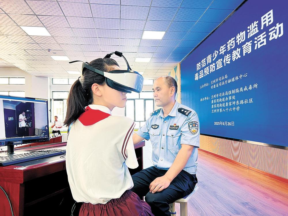 2025年6月26日,兰州市司法局强制隔离戒毒所干警走进兰州市第八十六中学开展禁毒宣传教育。图为学生佩戴VR眼镜,通过虚拟现实技术创造逼真的沾染毒品场景,让学生身临其境地感受毒品的危害。