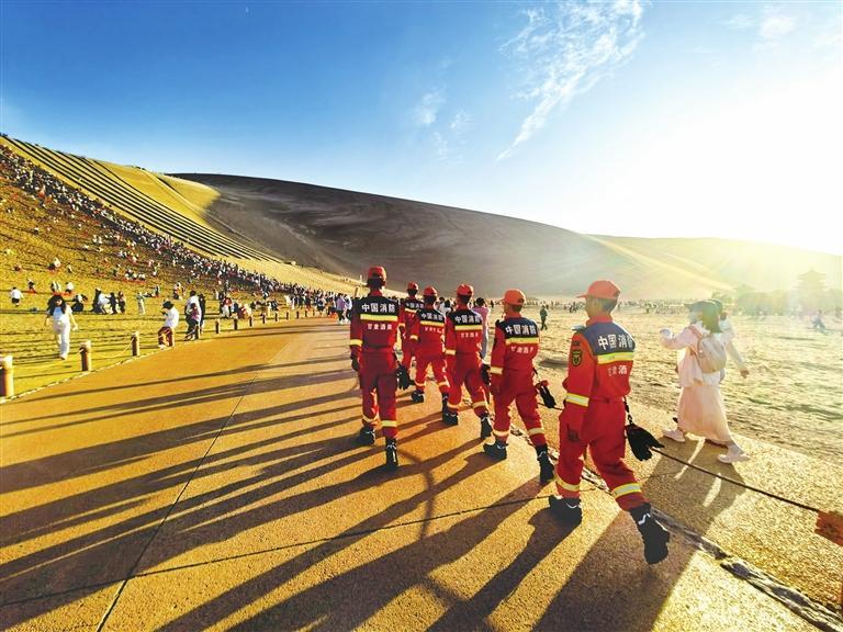 敦煌市消防救援大队指战员在鸣沙山月牙泉景区开展流动执勤。