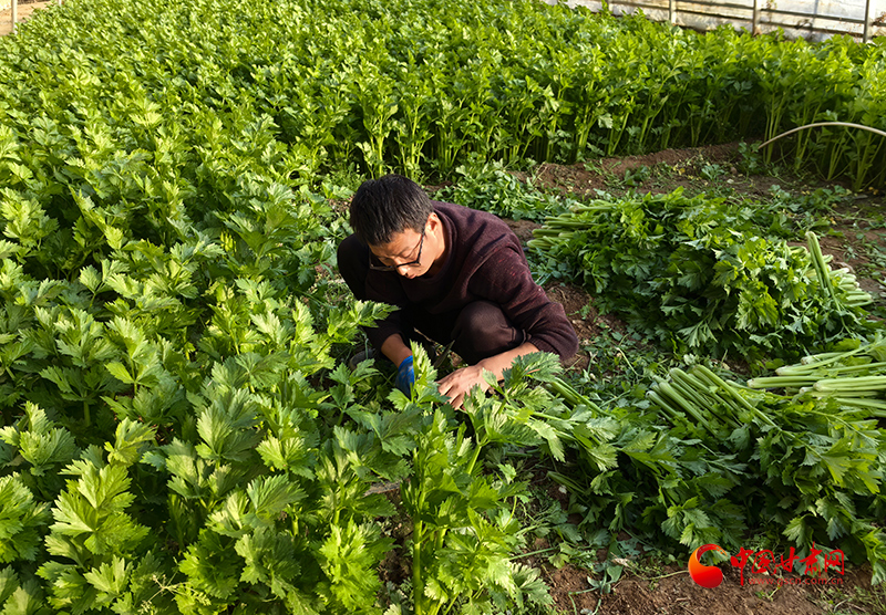 近日,在灵台县百里镇严家沟村的日光温室大棚内,一片翠绿生机盎然,株株芹菜茎秆挺拔、叶片肥厚,长势旺盛。种植户李宏博正穿梭其中,熟练地进行采收、捆扎,忙碌中洋溢着丰收的喜悦。这些新鲜采摘的芹菜即将被运往县城的蔬菜销售市场,供应百姓餐桌。