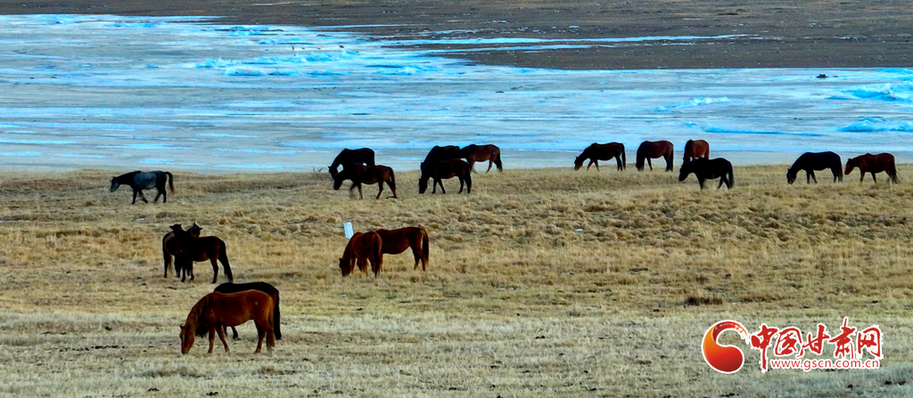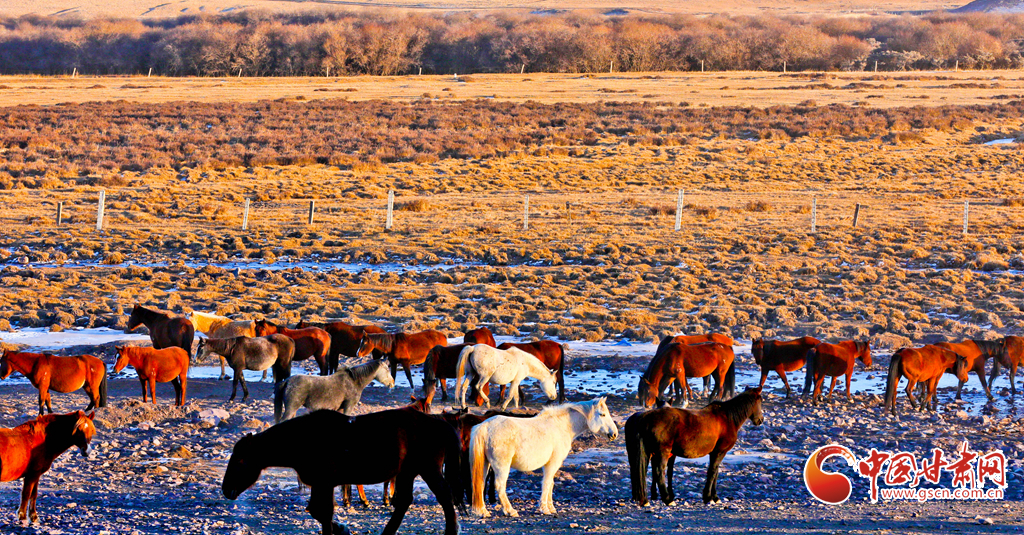 12月2日傍晚,夕阳映照下的张掖山丹军马场,祁连雪山巍峨耸立,皑皑白雪被染作金晖,呈现“日照金山”之景。辽阔草原泛起淡淡金光,成群骏马或悠闲觅食,或驰骋奔腾,身姿矫健,飒爽动人。牧马人策马扬鞭,尘土随蹄飞卷,共同勾勒出冬日马场独具韵味的壮美画卷。