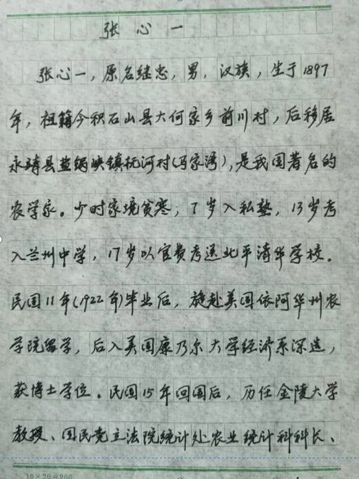 张孔来,男,现年91岁,国际流行病学专家、北京协和医学院教授。北京医学院1956届杰出校友,1979年至1981年赴美国加州大学洛杉矶分校公共卫生学院流行病学系访问学者,是该校来自中国大陆的第一批学者之一。1983年到北京协和医学院筹建流行病学和社会医学教研室。他的父亲张心一,甘肃省永靖县盐锅峡镇扶河村人,中国农业经济学家,1991年被授予有突出贡献、享受国务院特殊津贴的农业专家。他的外祖父是中国著名教育家黄炎培。他的妈妈黄路(又名张全平),是黄炎培的长女。关于张孔来教授,我是这几年才知道的。他的父亲张心一,我在永靖县县委办公室刚工作时,在县档案馆罗斌馆长办公室看到了介绍张心一的文章,我随即手抄了一份(照片:作者手抄《张心一》)。此时,我才知道我们家乡还出了一位农业科学家,是甘肃第一位官费清华留学生。1995年,我在兰州大学出版社出版的《永靖县志》第十七篇“人物”第一章“传记”第三节“共和国时期”,看到了《张心一》。2000年12月,我在甘肃省委党校专门史专业研究生班第三学期学习期间,兰州大学历史系教授王劲在《西北近现代社会研究专题》中给学员们讲“甘肃近代留学生与地方经济”时讲到了张心一在美国留学经历及任甘肃建设厅长6年中的政绩,并希望学员们“吸收留学生身上有用的东西”。2008年又在光明网看到了郑振源撰写的《张心一:我国农业统计学的奠基人》。2016年7月,在甘肃人民出版社出版的永靖县文史资料选集第十九辑《桑梓情怀——董应昌先生纪念文集》中,看到了张孔来教授撰写的《传奇的人生——农民之子张心一》(张孔来教授注:这篇文章不是我亲自写的,可能是我口述、由他人写的)。2022年2月7日,我看到了永靖县文联主席、作家王国虎撰写的《丹心济世 德重杏林——记我国著名流行病专家张孔来》。看了这篇文章后,我才对张孔来教授有了一个比较全面的了解。