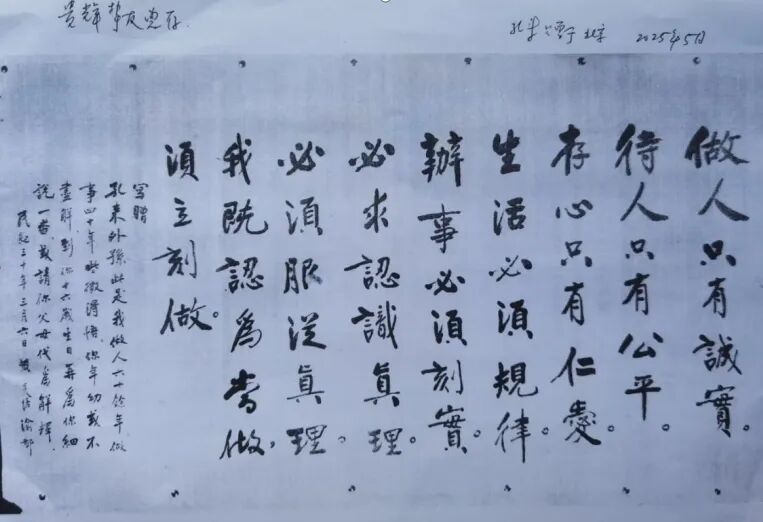张孔来答:我妈妈黄路,她是黄炎培的长女。我的外公外婆共生了12个孩子,我妈妈排行第四,上面有三个哥哥。妈妈小的时候笔性很好,字写得特别好。她在上海松江的姑妈丈夫英年早逝,没有孩子。姑妈喜欢黄路,我的外公外婆就让他们的大女儿去陪姑妈。结果后来就被姑妈硬是把她抢下来了,并过继给姑妈。因姑父姓张,就把黄路的名字改成张全平了。这样,妈妈就是在松江念的书。妈妈小时候很聪明,也很活泼。我把妈妈的姑妈叫恩奶。恩奶希望把我妈妈培养得更文质彬彬一点,就送她去上海市区天主教“启明”女子中学念书。这个女中办得很早,受天主教影响很大,对女孩子管得比较严格。我的恩奶把她送到这个学校,就是让她多学点“规矩”。后来又到苏州振华中学去上学。我妈妈是杨绛的师姐,苏州振华女中的老校长去世了以后想请杨绛做校长。杨绛没有时间,也不在苏州。杨绛推荐我妈妈,我妈妈住在上海,也就没有去成。妈妈在南京读的金陵女子文理学院,后来叫金陵女子大学。由于妈妈想学医,她在金陵女子文理学院上的是协和医学院的医学预科,读完3年就转到北京协和医学院。她在大学一年级的时候,心一就追求她,一直追到大学四年级毕业。心一1927年至1933年初任南京金陵大学农业经济系教授兼农业推广系主任、民国政府立法院统计处农业统计科科长、兼考铨委员会、国防设计委员会专门委员,还兼任中央大学农学院农业经济系教授。妈妈因为接受了张心一,就放弃了协和医学院。因为协和医学院不接受已婚女生。他们1931年6月25日在南京结婚,婚礼地点在女大礼堂,证婚人是女大的校长吴贻芳。妈妈头一天毕业典礼、第二天就是婚礼。几乎所有的同学和老师们都参加了婚礼。此时候家里的生活条件是非常好的,两人薪水一月1000银元,在当时是极高的(一银元可买一担大米),爸爸让妈妈管家里收入支配,原来每月给甘肃老家的爷爷奶奶寄50元,从这时开始妈妈每月就寄100元,逢年过节要再多寄50元。凡清华校友或甘肃老乡来借钱,妈妈尽量满足他们的要求,而且从不要他们还钱。1934年1月1日,爸爸去中国银行工作,主办农业贷款,就定居上海,心一和妈妈结婚后生活非常平静。1937年8月13日,日本人轰炸上海,我们一家三口分了两批,心一自己单独走的,我跟妈妈还有奶妈就辗转到了成都。心一从南京,经过安南(现在的越南)、香港,骑着一个带斗的摩托车,一个人就辗转到了成都,和我们碰头。1940年(民国二十九年)12月,蒋介石他们要给甘肃选派一个建设厅厅长,有人就举荐张心一。因为张心一是甘肃人,清华毕业,又是留美,又是学农业经济的。外公听到这个消息后,打电话到我们在重庆南岸汪山丁家寨的住处告诉我妈妈:心一要去甘肃当建设厅厅长。妈妈反对地说:“不去!不去!” 张心一决定要到甘肃去,可是妈妈心里还是犹豫的,因为在上海生活已经稳定了。即便到了成都,我时任北大教授的大舅黄方刚(清华学子、与心一同窗八年)也在成都同住一个屋檐下,生活还是相对比较稳定的。这种情况下,我妈妈当然不愿意去甘肃了。之前,妈妈跟爸爸去过一次甘肃,记忆犹新,何尝不怕!那是1932年,3月从北京出发,经过西安,然后到甘肃、青海调查土地利用情况,8月回到南京。出发前,为了路上方便,心一让妈妈剃了平头,穿中山装,女扮男装,途中坐火车、大卡车、木轮大车,骑牲口,遇土匪、放羊娃、传教士,见被人吃光皮的树、象小黑豆豆的羊粪蛋、光屁股十多岁女孩,有时一天走五六十里路,住小客店,路上只有锅盔吃,没有洗过澡。7月到老家马家湾看望我的爷爷奶奶及亲戚,还住了33天。妈妈给抽鸦片的公公、裹小脚的婆婆磕头,亲眼看到婆婆一手抓牛羊粪煨炉灶,一手擀面的情景。爸爸晚上还教妈妈在炕沿用指甲摁过长在身上的虱子。这一切,都是妈妈有生以来没有见过的。妈妈感到新奇!贫穷!所以她内心是不愿意去甘肃。这个时候我外公就说话了,外公严肃地对我妈妈说:“路路,心一是去‘做事’,不是去‘做官’。40岁的人了,还不做些事,等待何时?心一这时候最需要你的支持。你应该跟心一去,你若怕吃苦不去,你就不是我的女儿。”由于外公的这种大义,我妈妈就接受和心一一块去了兰州。临行前,外公给心一赠写了一个条幅:“路入西陲总不平,黄尘一片怒笳声。河山画意兼诗意,欲哭民生了此生。得道不求多助效,策功终仗好谋成。诸君为国须相忍,西北天高莫便倾。题何叙甫画西北游程长卷 心一贤婿服官甘肃临行写赠 民国三十年三月黄炎培渝赠”。从这个条幅看,外公对心一赴甘肃建设给予了多么深厚的劝勉和忠告。我今天(2025.5.25)给你的这个条幅是外公当时写给我的。(照片:黄炎培给6岁外孙张孔来题字手迹,张孔来题签赠本文作者)。内容是:“做人只有誠實。待人只有公平。存心只有仁爱。生活必须规律。辦事必须刻實。必求认識真理。必须服从真理。我既认为当做,须立刻做。写赠孔来外孙,此是我做人六十余年,做事四十年些微得悟,你年幼或不盡解,到你十六岁生日再为你细說一番,或請你父母代为解釋。民国三十年三月六日黄炎培渝都”。外公将自己为人一甲子、做事40年的感悟浓缩为一幅字,希望我16岁时可以懂。他如在世,会亲自讲给我听。他如不在,父母可以给我讲。外公教我“诚信”“爱心”“人最要紧的一点就是做人诚实,你的看法可能受