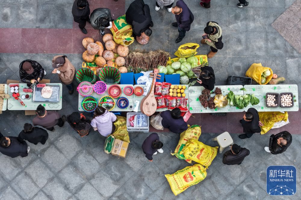 12月13日,居民在陇南市武都区“冬至大集”上选购特色农产品(无人机照片)。