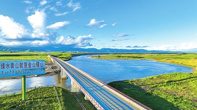 盛夏时节,在玛曲县黄河大桥极目远眺,一望无际的草原上植被茂盛,远处山峦叠起、青山依旧。